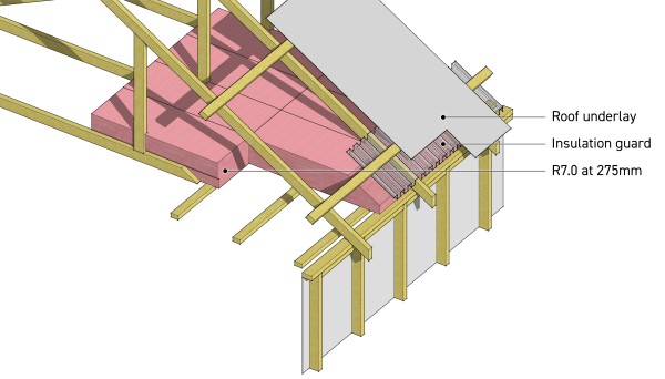Under the 5th Editon of H1 (effective in Nov. 2021), the last 500mm of the perimeter of the roof insulation could be reduced to R3.3; this allowed the insulation to carried out over the top plates of the wall, while reducing the barrier to air flow from the eave edges. With the 6th Edition of H1 update (released in Nov. 2025) the roof minimum R value has been further reduced to R2.6 and is applicable across the entire ceiling area. While this reduces the insulation thickness, there is however still a high risk, particularly in roofs with a pitch below 30 degrees of the insulation touching the underside of the roof underlay at the roof edge, preventing ventilation of the roof space, and creating a condensation and mould risk.